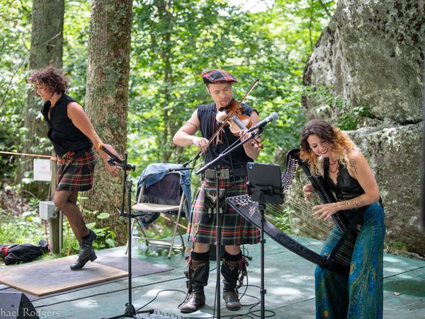The group is the brainchild of Abbie Palmer (electric harp, vocals, producer, programmer) she is joined by U.S National fiddle champion Seán Heely (fiddle, vocals), Agi Kovacs (percussive dance), Jesse Ofgang (assorted bagpipes and whistles) and Lucas Ashby (audio engineer, percussion).